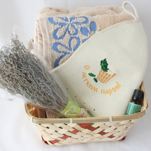 Состав: лукошко без ручки - полотенце, веник,  арома масло 1шт , шапка для бани