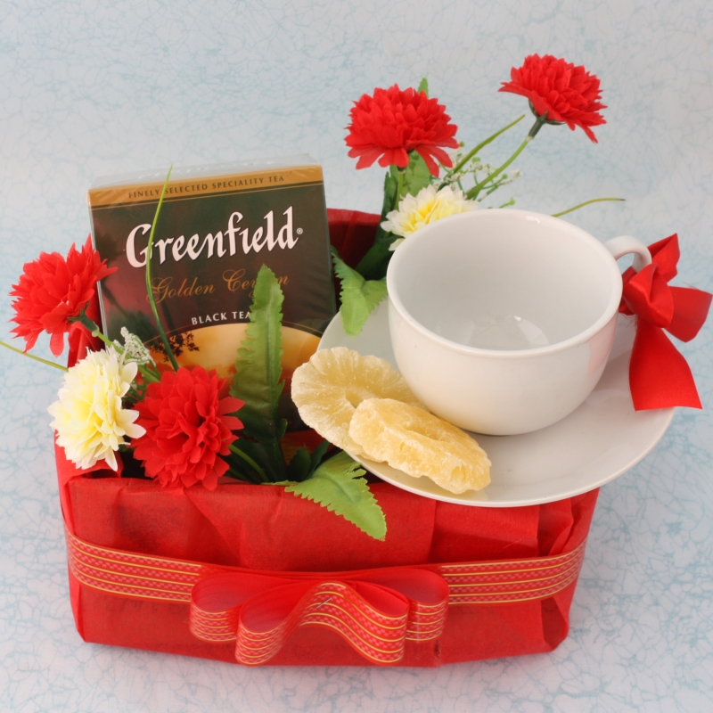 Состав:  цветы 2шт,чашка, чай Гринфилд ,сухофрукты, открытка