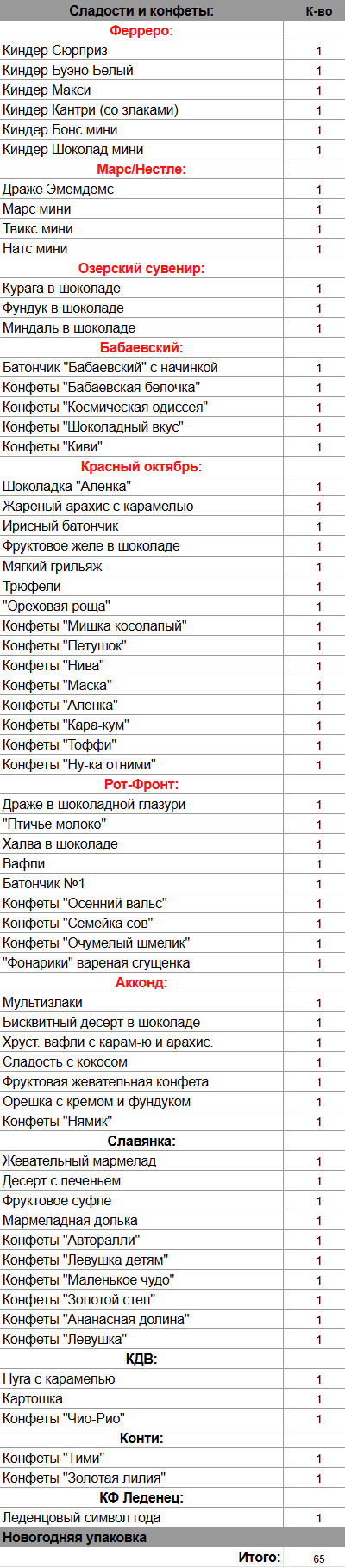 Кол-во сладостей: 65 шт.